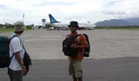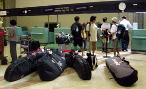 8月30日8時45分 成田第2ターミナルGカウンター前。東京から参加のトッチーがまだ来ていない。彼は今回の旅に最後に参加することが決まったメンバーで、他のメンバーとの面識は全くない。Bobby氏の紹介で今回の参加となったのだが、誰も一緒に波乗りしたことがなく、ガンを4本持ってくるあたりからものすごい突っ込み野郎ではないかと噂されていた。そのトッチーがいないのだ。電話してみると「今、浦安です」とのこと。おいおい間に合うのかよ!!結局は10時前には何とかチェックインに取りかかることができた。