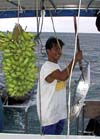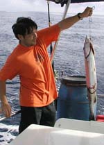 9月2日 朝起きてみると天気は最悪。風と雨がすごくてフォーボブ近辺は全滅。そこで移動してイーベイへ。向かう途中でcharlieがワフーを釣り上げた。これは旨いぞ!!