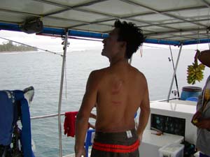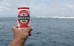 ビンタンライトとランシスレフトに到着したときには、すでに船が5隻も停まっている。ランシスレフトにとりあえず入る。サイズは2〜4フィートといったところか。charlieは6'8"で入ったのだがやられまくってすぐに7'0"にチェンジ。なんとか数本乗れたかなって感じでした。トッチーはつっこみをくり返しリーフにやられていました。背中に勲章も残していました。サイズのあるレフトに手こずるメンバーも多いように感じた。本来ならJINJINがフロントでバシバシやる予定だったのだが、どうもバックサイドの方が得意らしい。