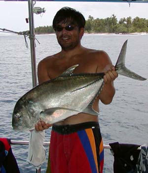 それを船上でほどいているとほんの10mほど先にナブラがたっている。うそだろーーーー!!早く早く!!ラインをポーターにほどいてもらってすかさずキャスト。ナブラのど真ん中に落ちてしまって、やばいかとも思ったが1回目のポッピングで出ました!!しかし乗らない。その場でトゥイッチング・・・・ひったくられるようにロングペンが水中に消えていった。浅瀬ということもあってきつめに締めたドラグこそ出さないものの明らかにガーラの引きである。久々にサザンクロスのしなりを見たって感じでした。約2分ほどで上がってきたのは、小柄ながら明らかにジャイアントトレバりーであった。狙って釣ると本当に嬉しかった。本来はリリースすべきなのだが、今回は食することになった。刺身は意外といけました。