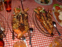 さあ、港に行って出港だーと思ったら、ひとまずホテルで一休み。ホテルには外人サーファーがいたり、トッププロのサインがあったりしてなんかきんちょーしてきたぞ!夕飯はガイドのアントンがシーフード料理に釣れていってくれた。ホテルからタクシーで10000ルピーでいけるところにその料理屋はあった。池には鯉が泳いでいて何となく豪華な感じである。ロブスターだのナシゴレンだのこれでもかっていうくらいぜいたくな食事をしました。