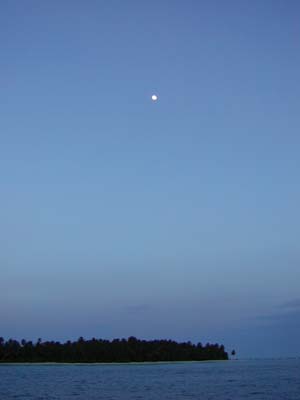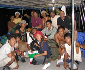 実はもっと大きい船を想像していたのだが、大きさ的にはいつもモルジブでお世話になるセレステ号くらいの大きさであった。6人は船首部分の客室に荷物を押し込んで暗闇の海へ出発したのであった。風はなく穏やかな海に滑り出したelectlic lamb号は7ノットほどのスピードでゆったりと進んでいく。もうすぐ満月なのであたりはかなり明るい。待ちに待った出港のための乾杯がしたかったのだが、冷蔵庫のビールはまだ冷えておらず、仕方なくしばらく待つことに。そのうち船の揺れに慣れないメンバーは1人また1人と部屋に消えていくことになり、地獄のナイトクルーズの始まりとなったのであった。ホントにしんどい航海であった。ものすごく穏やかな海の航海でこれだから、船酔いに弱い人はメンタワイサーフトリップはやめた方がいいかもしれない。