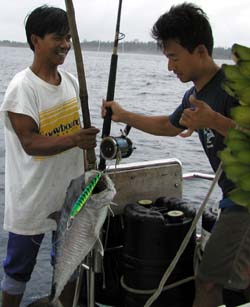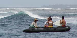 あまりに混雑していて波取りに疲れたcharlieはポーターという現地ガイドとともに釣りに出かけることにした。ニャンニャン島の南にある島のまわりはいい漁場らしいのでそこに連れて行ってもらった。レフトの波が綺麗に入っていてここもサーフできそうに見えた。ポーターはチュミチュミを餌に底釣り、charlieはトップでポッピング。底釣りだと入れ食いだったが、トップでは何も出ない。リーフに近づきたいのだが波が大きくて寄れないので思うところへキャストするのは困難であった。そこで今度はもう少し東の浅瀬を狙うことにした。ポーターは浅すぎて釣れないとぼやいていた。まずは適当にその辺にキャストするも無反応。そのうちライントラブルでPEがもつれてしまった。