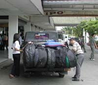 ところが、毎回ここで一悶着起きる。ガルーダの場合、エコノミークラスは一人あたり20sまでの手荷物とサーフボード20sまでと制限されている。サーフボードケースに他の荷物を入れているメンバーは当然重量オーバーとなる。しかし、全員のトータル重量では制限重量範囲内なのでそれでいいのではないかと思うのだが、20sを越えた荷物は20sに満たない荷物に中身を移せとのことであった。いったい何のためだろう?道具を運搬する人の腰が痛まないようにという配慮であろうか?そこのおねーさんはとても意地悪そうな感じだった。まあ、彼女をそういう風に替えてしまったのも、おそらくは荷物を大量に持ち込もうとするサーファーのせいなのであろう・・・。