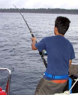 9月1日 朝起きるともうそこには目指すシベル島があった。海は凪いでいて面ツル。気持ちのいい朝である。早速、友人からもらってきたカジキ用のルアーを流してみた。しばらくすると、PE5号がうなりを上げる。手間取ることなく上がってきたのはバラクーダであった。さいさきよいスタートだ。