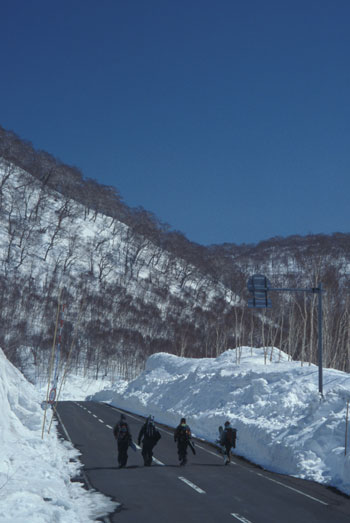 3月28日 今日もピーカン。近場で春を満喫する作戦を開始した。今日の裏山ハイク隊はJINJIN、hayakawa氏、狩太氏、charlie、そして市ちゃんの5人である。のんびり用意をして目指す裏山へ約2時間の楽々ハイクアップ。自分の滑りたいラインを選びながら春の雪を踏みしめた。