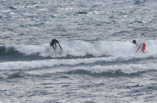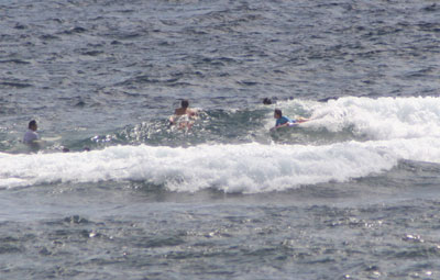 満潮が20時52分ということと風波ぶよぶよということで、ほとんどサーファーはいない。休日の混み具合もちょっと見せたい気もするが、実際に波乗りをするなら無人の方がいいに決まってる。とりあえず、入れるときに入っておきましょうということで早速入水。バレルのみでジャリ貸し切りという願ってもない状態とあいなったのである。風波ではあったがそれなりにみんなで楽しく波乗り満喫。