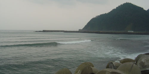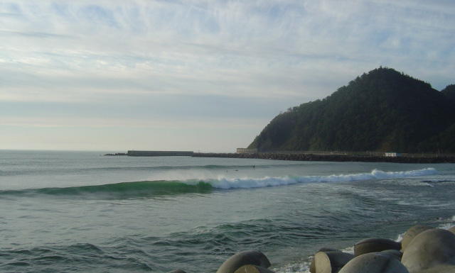 狩太さんも日付変更線を余裕で越える盛り上がりで夜は更けていった。翌朝、温泉に入り、道の駅で買い物をすませ日本海をチェックする。風はオンショアで腰くらい。ためしにと入ってみるとカレントがきついー