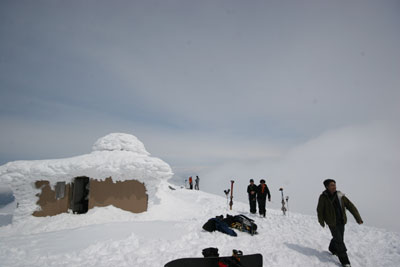 4月15日 天気予報では雨のち曇り。朝から低い雲がたれ込めてはいるが雨ではなく雪。D-takaカップルとyamaちゃんが合流し、sugawara氏を先頭にみんなあちこちの壁にこすりながら降りていく。そのうちガスが切れ始めアンヌプリのピークまですっかり抜けた。それをじっと待っていた一番目のライダーが長いスプレーを上げながら大斜面を降りていくのを見て、一気にテンションが上がりいちもくさんで駐車場に戻った。