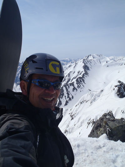 360度パノラマの景色を楽しむ余裕もあまりなく斜面チェック。雪はすでに緩みすぎている気がした。雪崩や雪庇崩落、滑落リスクを自力でなんとかして登頂したことは素直に嬉しかった。ピークは携帯が?がるため、報告を兼ねこれから滑ることを伝えておく。ピークの奥の少し下がったところに平たいところを発見しそこで板を履いて準備完了。天気はサイコーだし、あとは気分をのせてつっこめばいいだけだった。