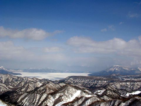 凍った支笏湖と右手に風不死岳