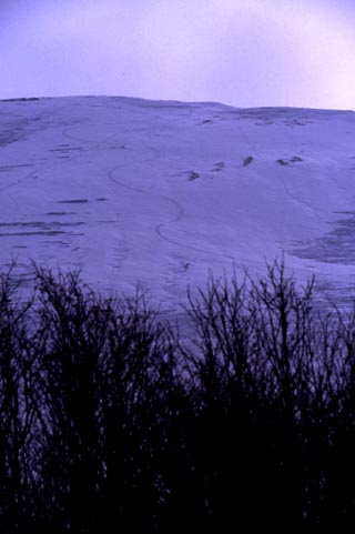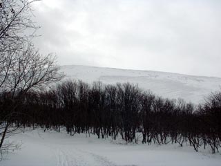 これが南東側の斜面。下にいかにも雪崩が走りそうな沢があるでしょ。
